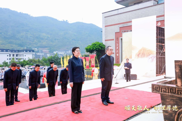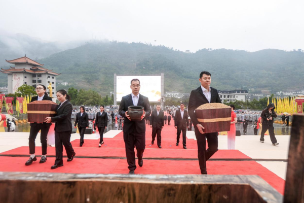 初獻環節,陳華、王莉淨手禮畢後,緩步走向主舞台,向曆代祖師宗師獻爵、獻帛。全體敬拜人員行三鞠躬禮,以此傳遞茅台人飲水思源、感恩先輩的虔誠心意。