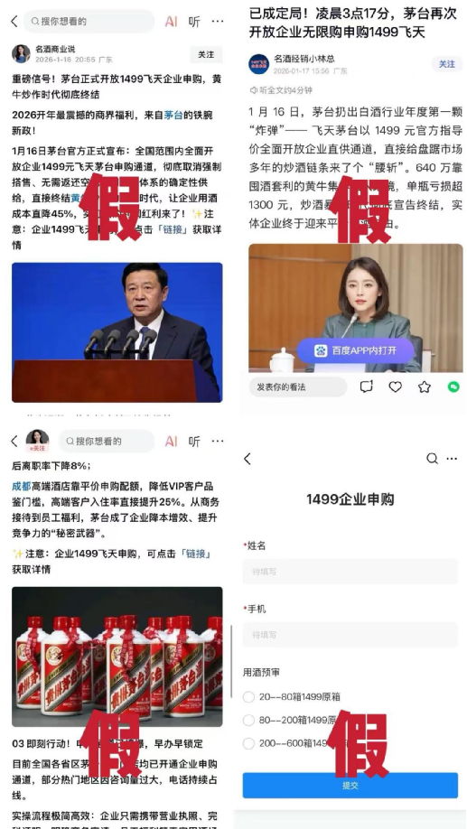 近期,線上平台再次出現冒用茅台名義,發布“開放企業直供通道”“企業1499飛天申購,點擊鏈接獲取詳情”“飛天茅台官方申請入口”“無需搭售、點擊鏈接立即申請”“1499元企業申購通道”等虛假招商信息,有關內容均屬不實宣傳,存在誤導消費者、甚至詐騙風險。