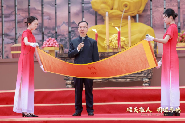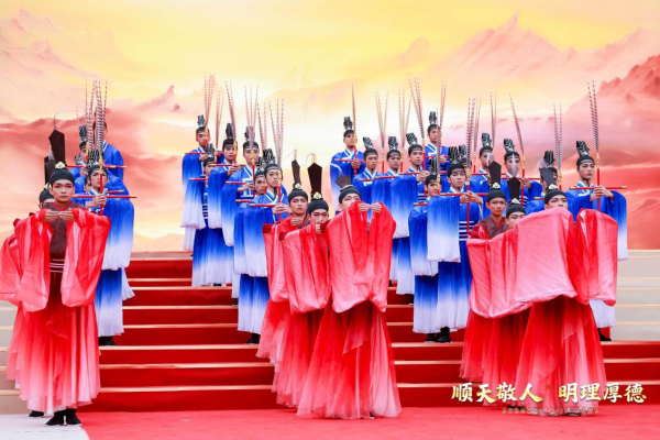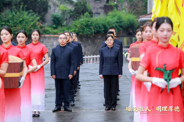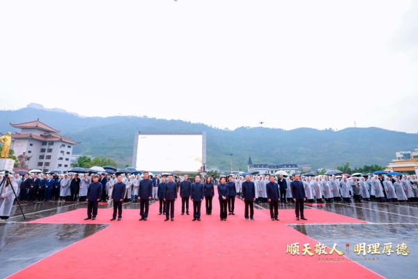 初獻環節,陳華、王莉淨手禮畢後,緩步走向主舞台,向曆代祖師宗師獻爵、獻帛。全體敬拜人員行三鞠躬禮,以此傳遞茅台人飲水思源、感恩先輩的虔誠心意。